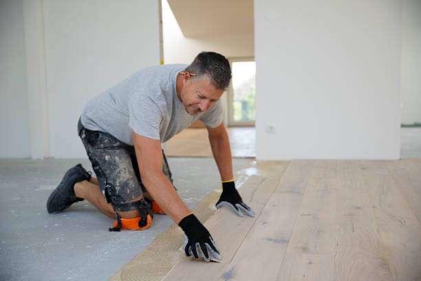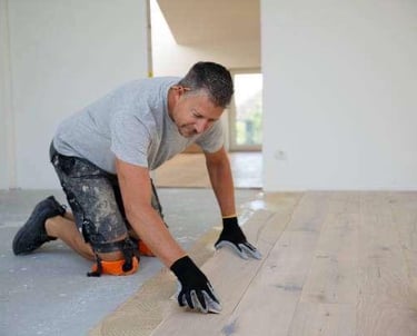 Pose de lames de parquet avec un ajustement régulier pour obtenir un sol stable et esthétique. Le travail garantit une finition propre et durable.