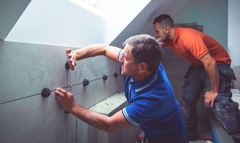 Pose de carreaux avec un nivellement régulier pour garantir un rendu propre et durable. Le travail assure des joints alignés et une finition nette, adaptée à tout type d’espace.