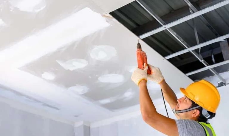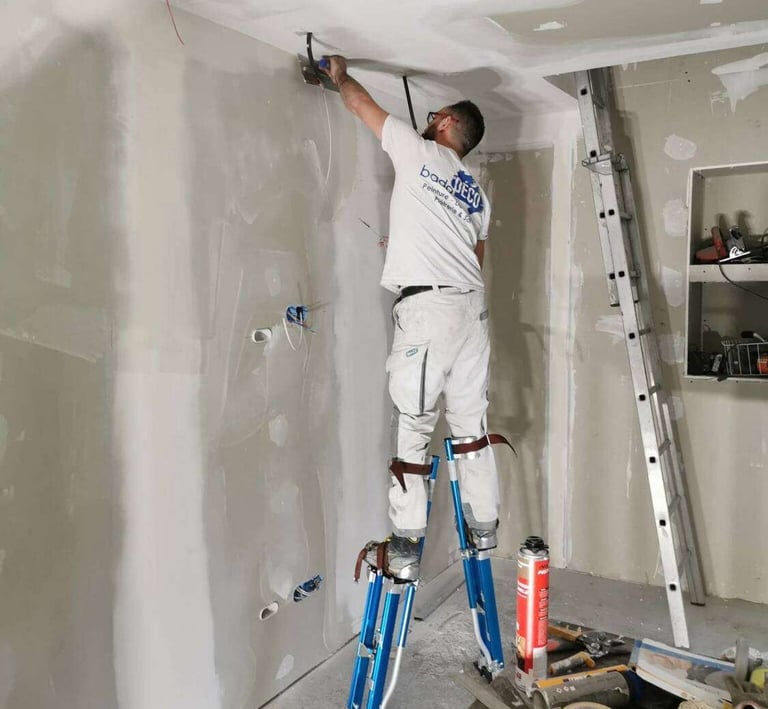 Fixation de plaques de plâtre pour créer une surface stable et prête à être finie. Cette intervention assure une base solide pour un aménagement propre et durable.